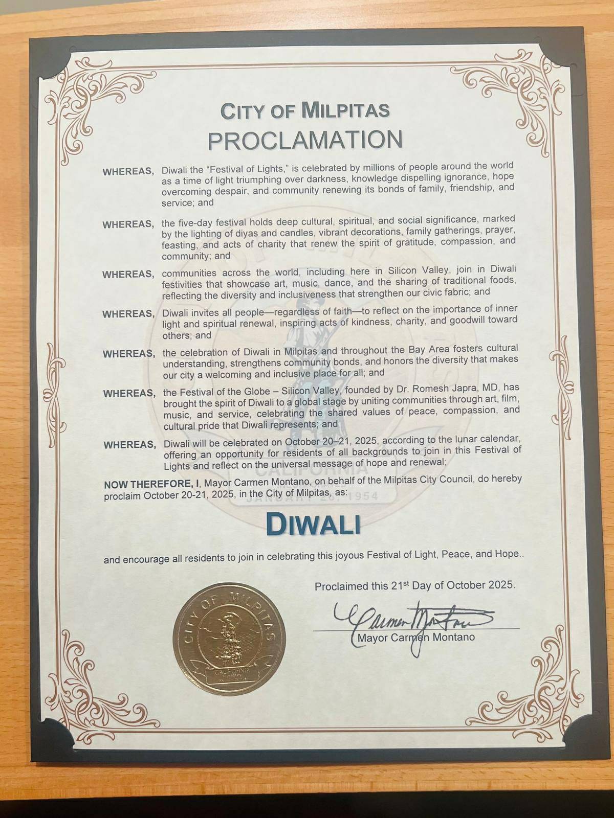 Milpitas, CA: On Tuesday, October 21, 2025, the Proclamation for Diwali the Hindu Festival of Lights was presented by the City of Milpitas Mayor Carmen Montana.