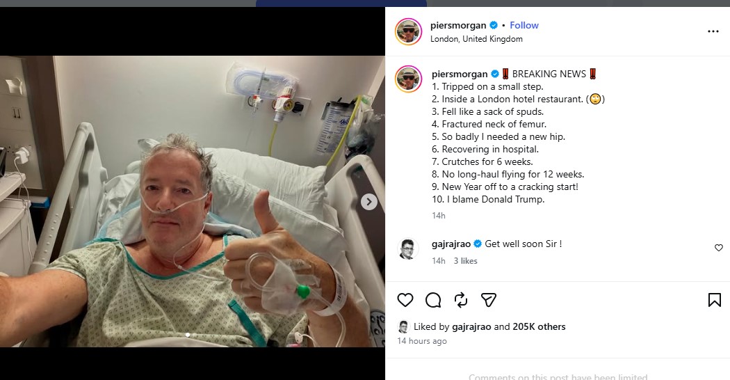 Taking to Instagram, Piers posted a picture of himself from a hospital bed. In his caption, he informed his followers that he “tripped on small step” in a hotel restaurant in London and wound up fracturing his femur.