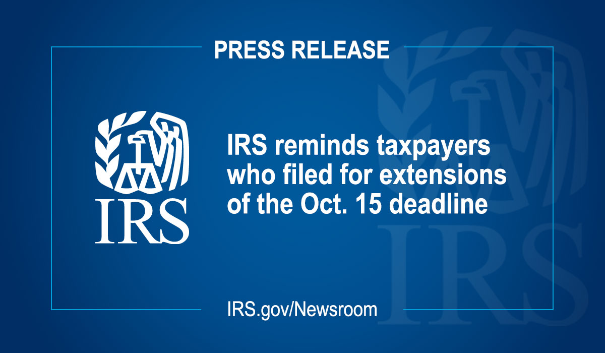 WASHINGTON — The Internal Revenue Service today reminds individuals who filed extensions for tax year 2024 that their tax returns are due tomorrow. Further, the agency reminds taxpayers that the current lapse in appropriations (the government shutdown) does not affect the tax filing and payment responsibilities of taxpayers. The IRS estimates that more than 20 million taxpayers were expected to file tax returns by the  extended due date this year.