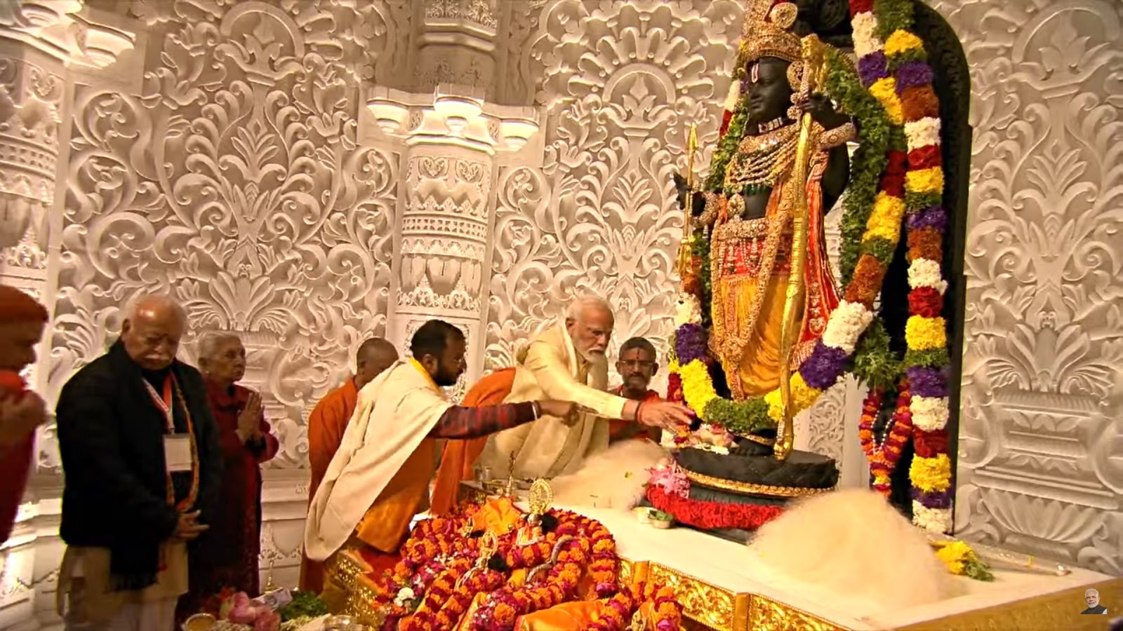 PM Modi who was accompanied by RSS Chief Mohan Bhagwat, Uttar Pradesh Chief Minister Yogi Adityanath and Governor Anandiben Patel, and offered prayers at Mata Annapurna Mandir. He also offered prayers at the Saptmandir at the Ram Janmabhoomi Temple premises, ahead of the flag-hoisting ceremony at the temple.